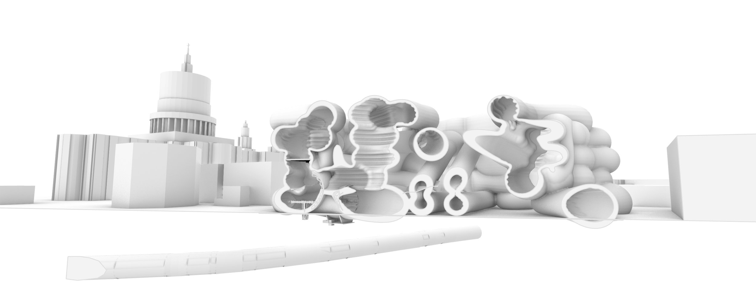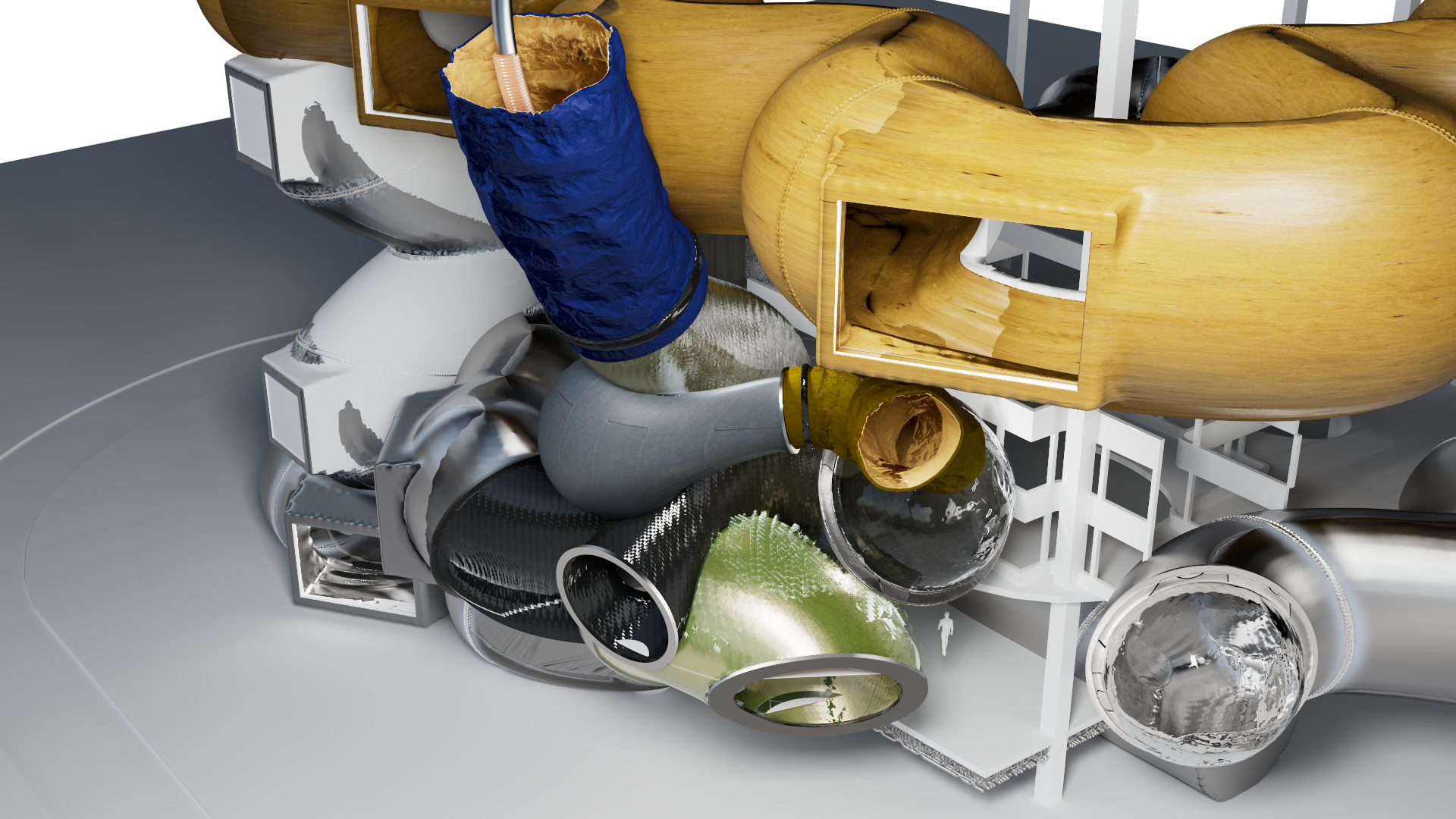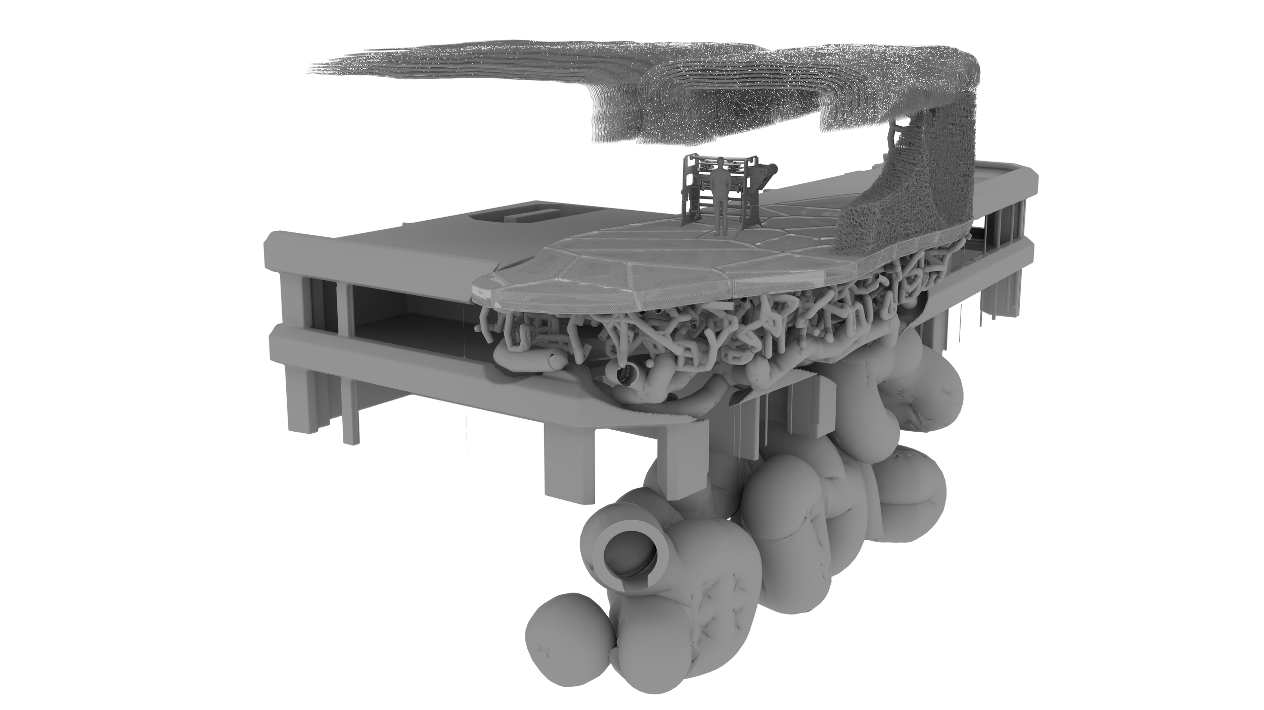 Fetishizing engine construction to create toy-like assembly of spaces.